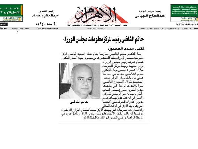 Acting Prime Minister, Dr. Essam SHARAF, has issued a decree appointing Dr. Hatem EL-KADI as the new Chairman of the Information and Decision Support Center (IDSC) for the Egyptian Cabinet, effective 24 November 2011. Dr. Hatem EL-KADI has graduated from the EECE Dept. in 1983 and has been a Staff member since 1993, after obtaining his Ph.D. from Lile University (France). Dr. EL-KADI has been involved in many of the activities related to the introduction of the IT technologies in local governments in Egypt first through his association with the IDSC and then as an active member and consultant to the Ministry of Administrative Development. His latest assignment before his appointment as Chairman of IDSC was as the Executive Director for National Management Institute. He has recently co-authored a research article entitled "THE INFLUENCE OF E-GOVERNMENT ON ADMINISTRATIVE DISCRETION: THE CASE OF LOCAL GOVERNMENTS IN EGYPT" published by John Wiley.