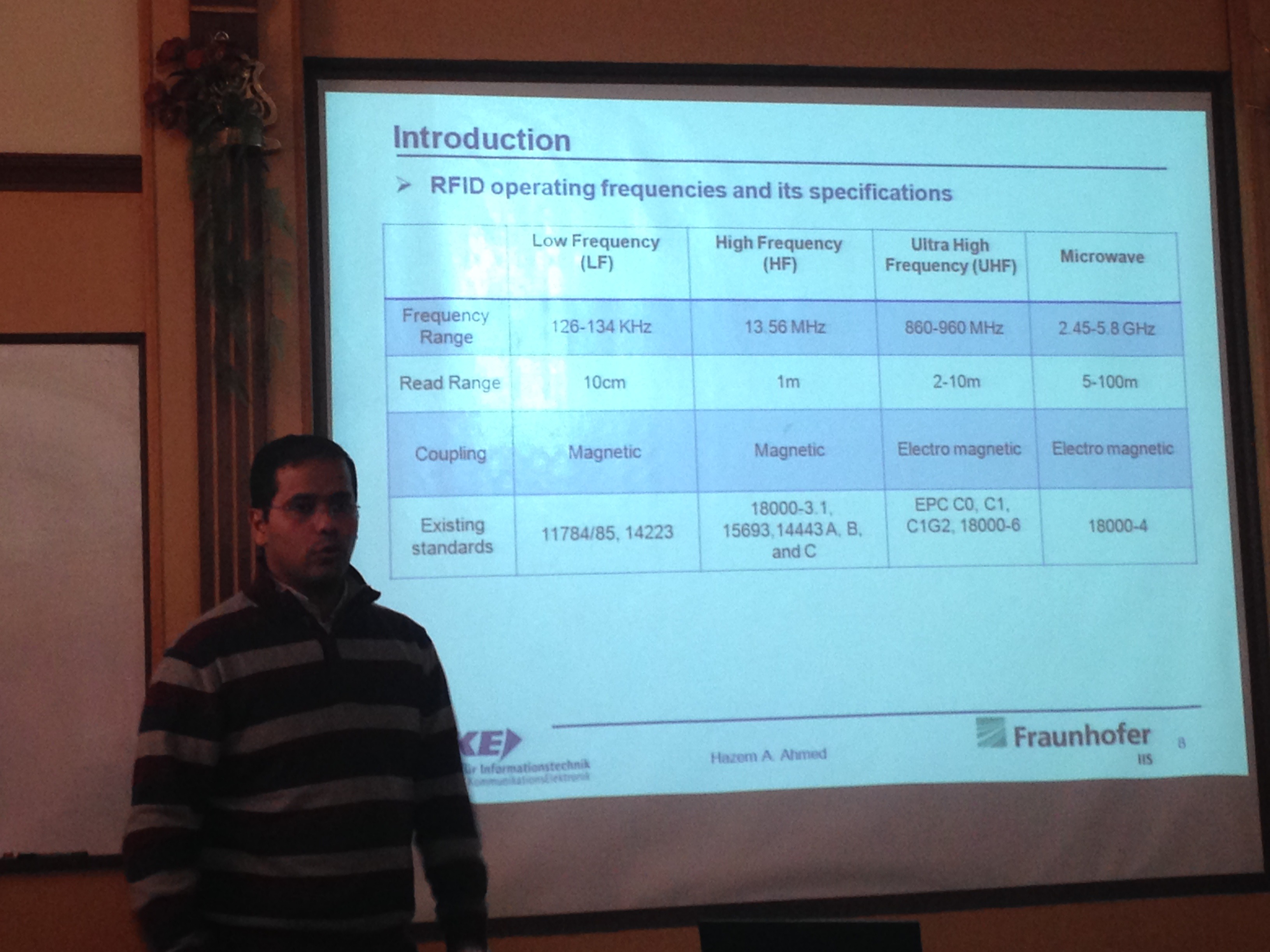 The Electronics and Electrical Communications Engineering Department had the pleasure to welcome Eng. Hazem AHMED - one of its 2005 alumni - and currently a Ph. D. Candidate at Friederich-Alexander University (Erlangen-Nurnberg) in Germany. Eng. AHMED delivered a talk at the EECE Department - in Library Hall - that was attended by many EECE Staff and students. It was followed by a Q&A session which helped illustrate some of the new trends in the RFID Research and current activities taking place in his lab. Following is a short description of the talk and a brief biography for the speaker.