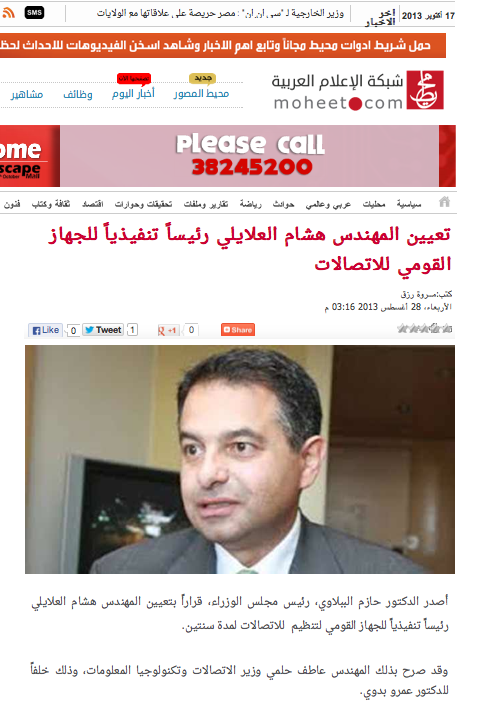 * Eng. Hisham EL-ALEILY - EECE Alumni 1984 - has been appointed as new Executive President of Egyptian National Telecommunication Regulatory Authority