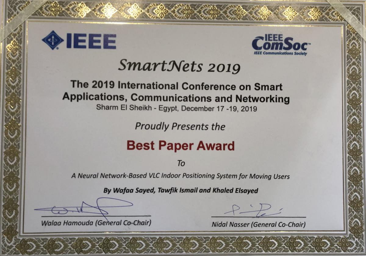 Eng. Wafaa SAYED (EECE1991) received "Best Paper Award in IEEE SmartNet 2019 Conference that was held in Sharm El-Sheihk, Egypt during the period 17 - 19 December 2019. Her paper is entitled:
