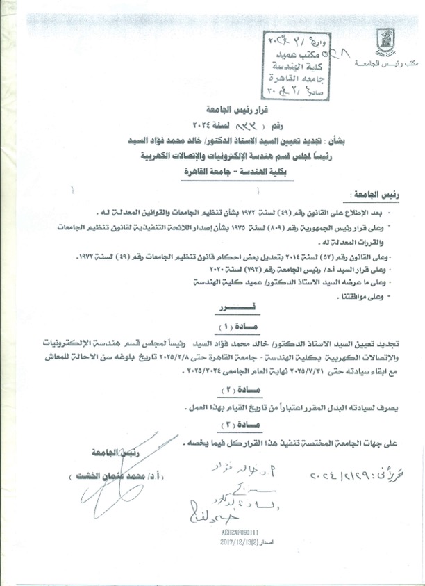 On 29th February 2024, the President of Cairo University has issued a decree to renew the appointment of Prof. Khaled ELSAYED as Head of the EECE Department. The new term ends on 31st of July 2025.